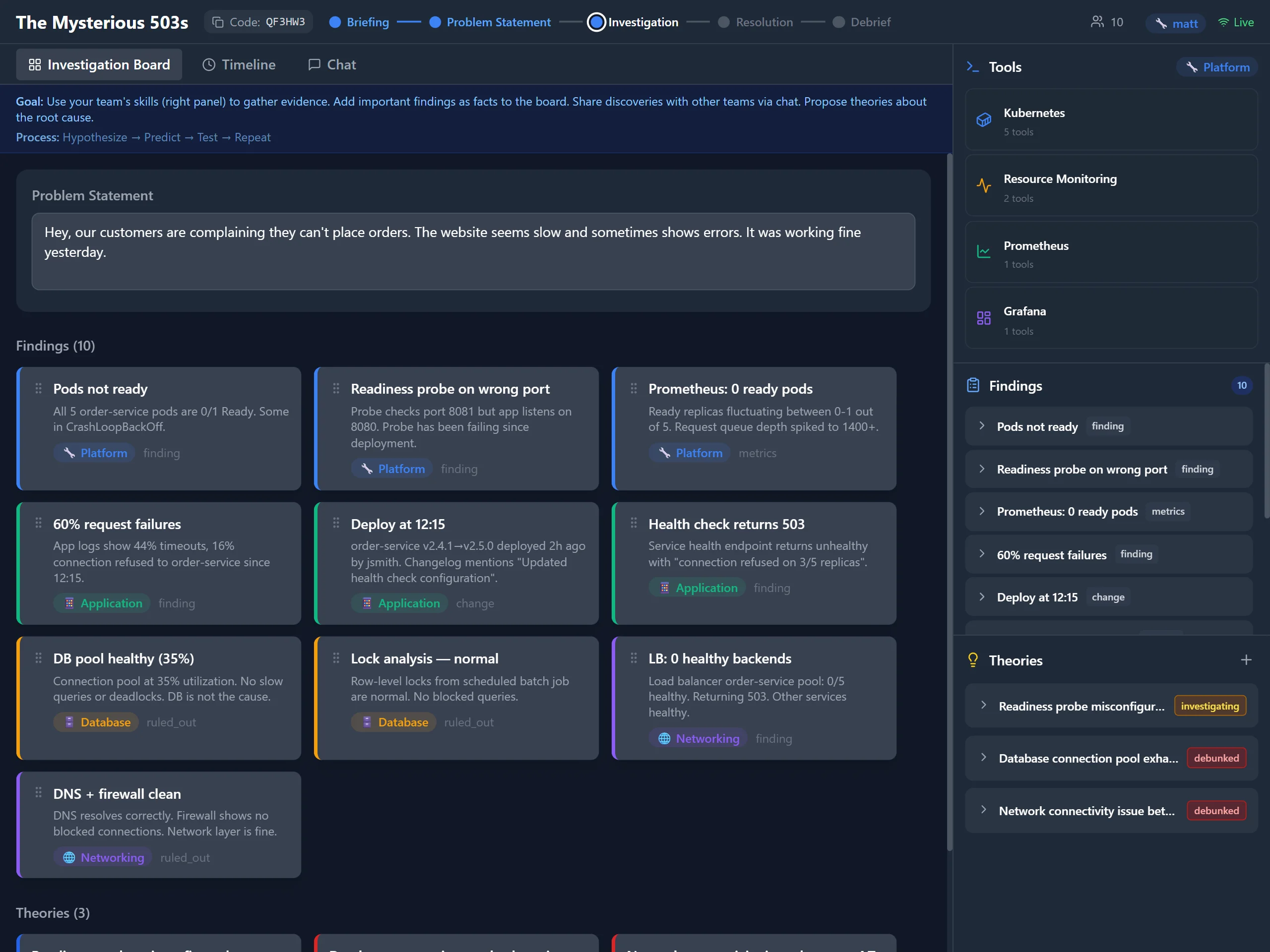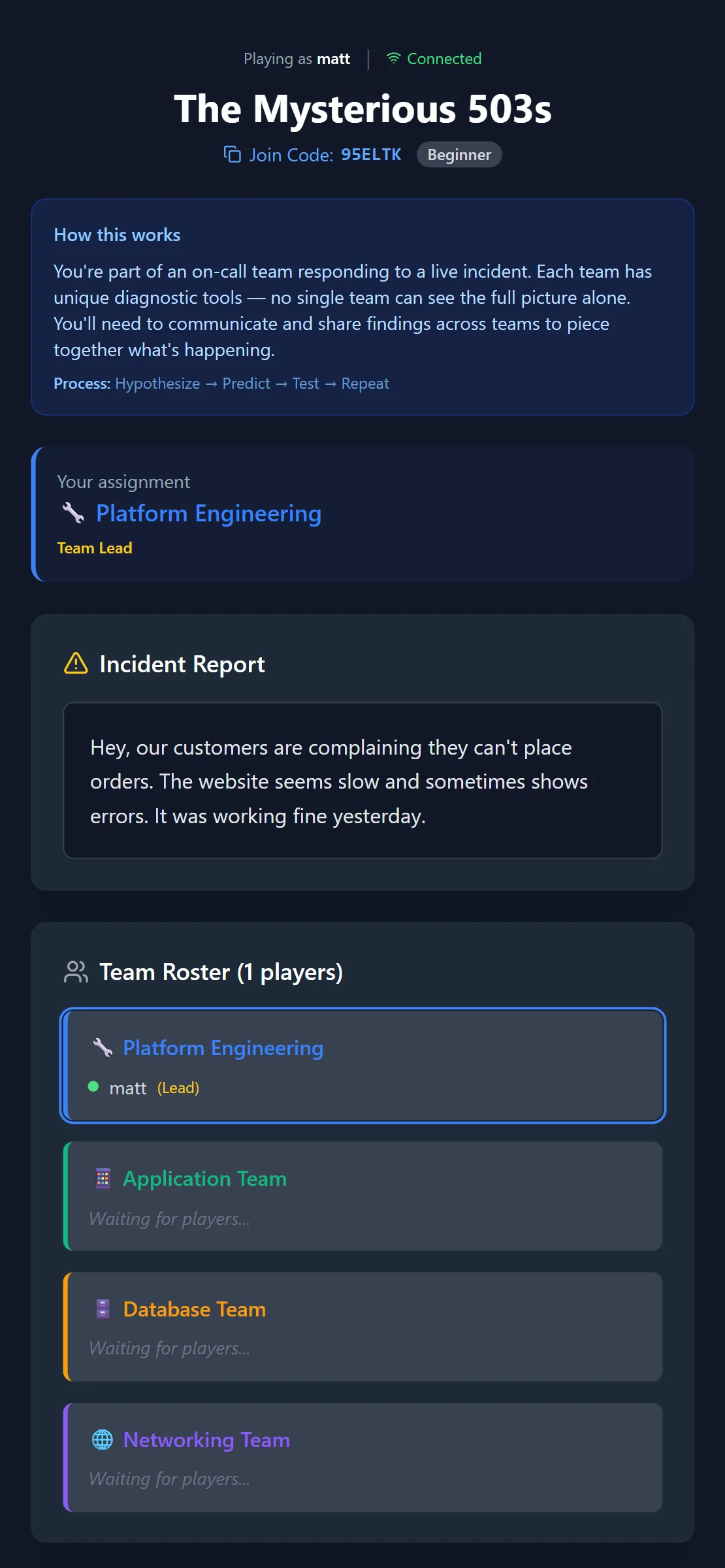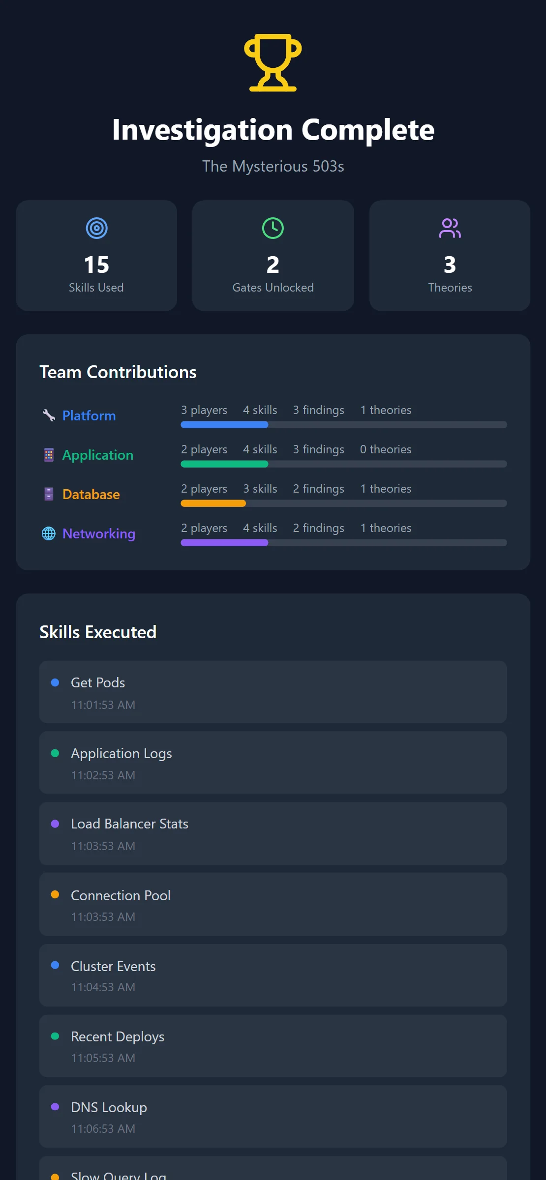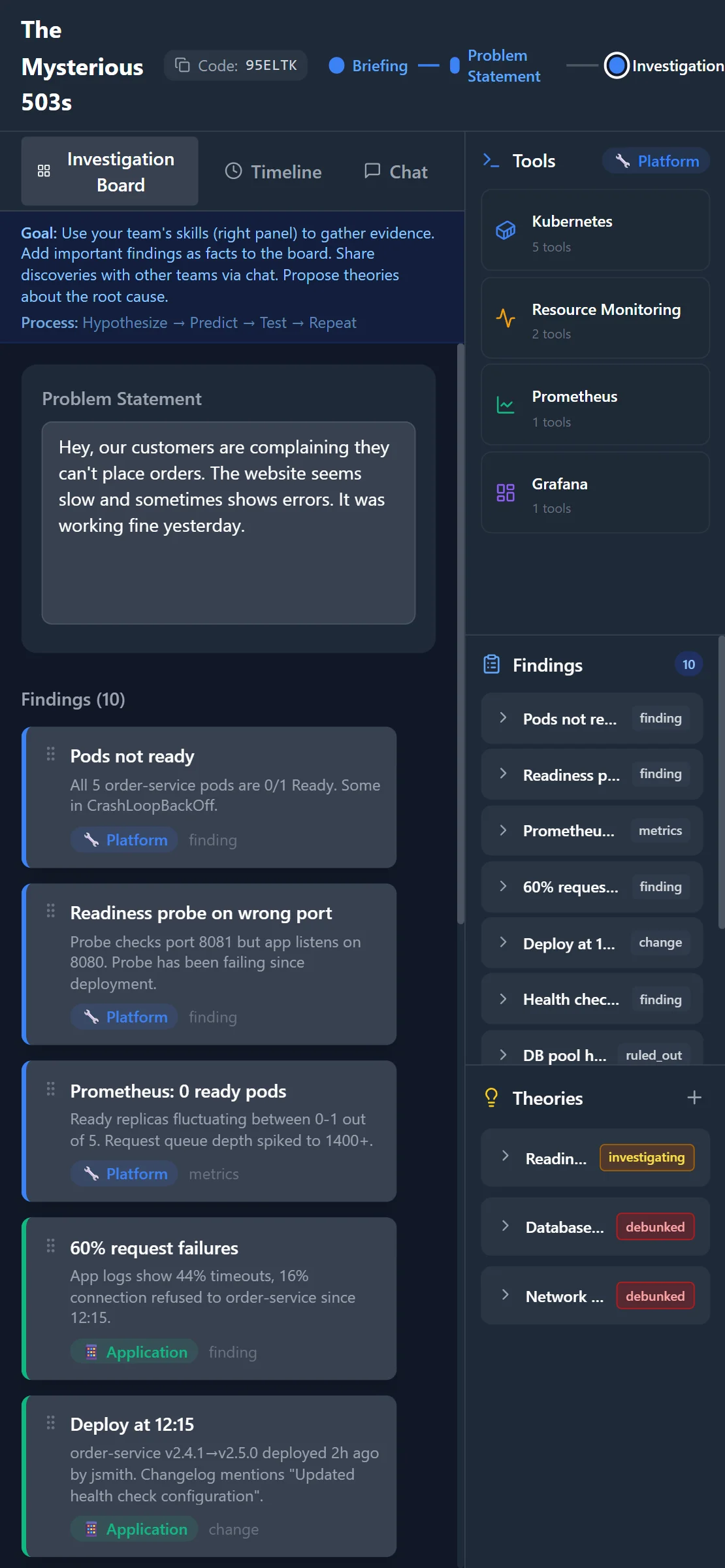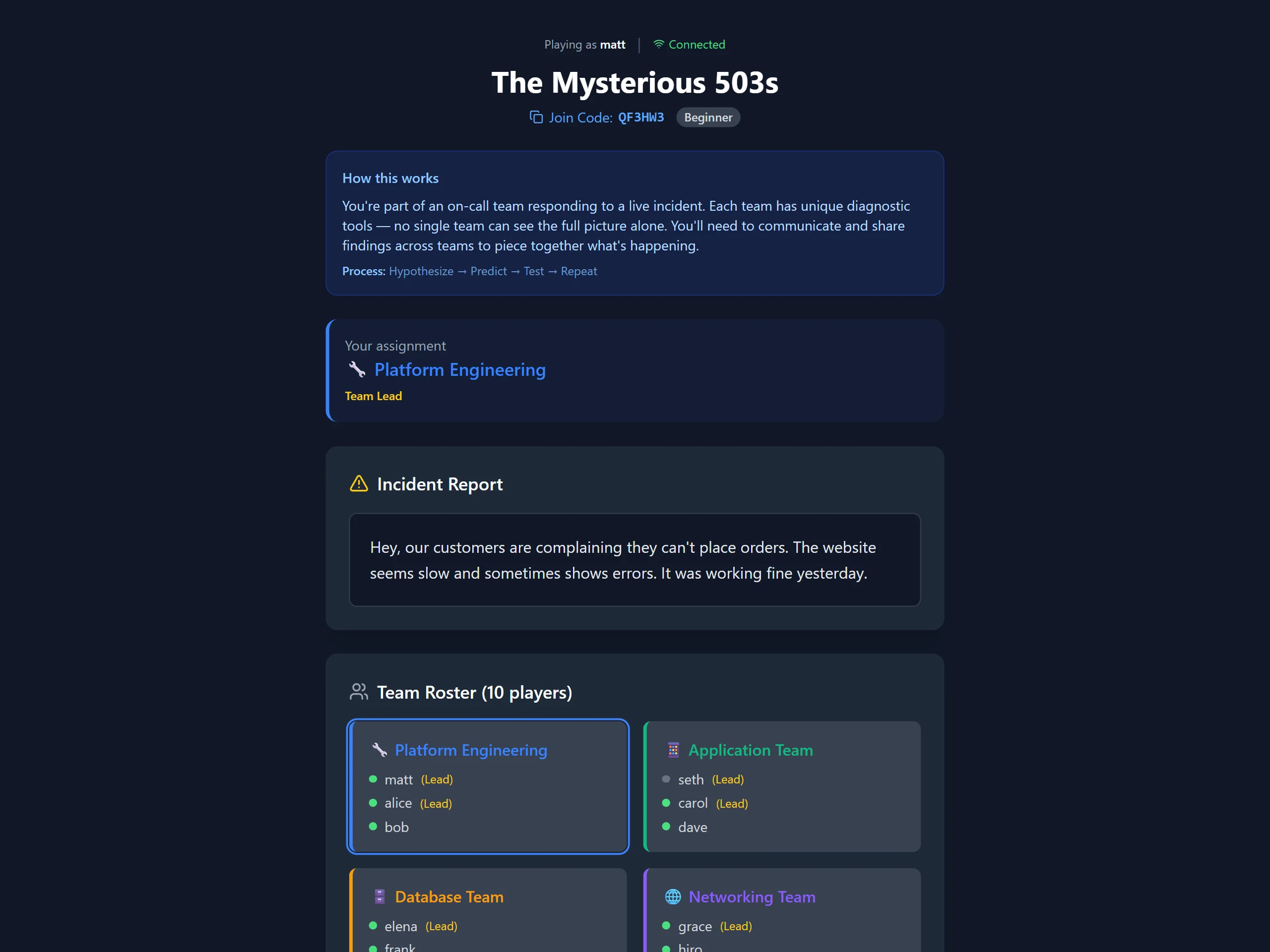 A multiplayer simulation where engineering teams investigate outages, share clues, and collaborate to find the root cause — building the troubleshooting instincts that only come from hands-on practice.